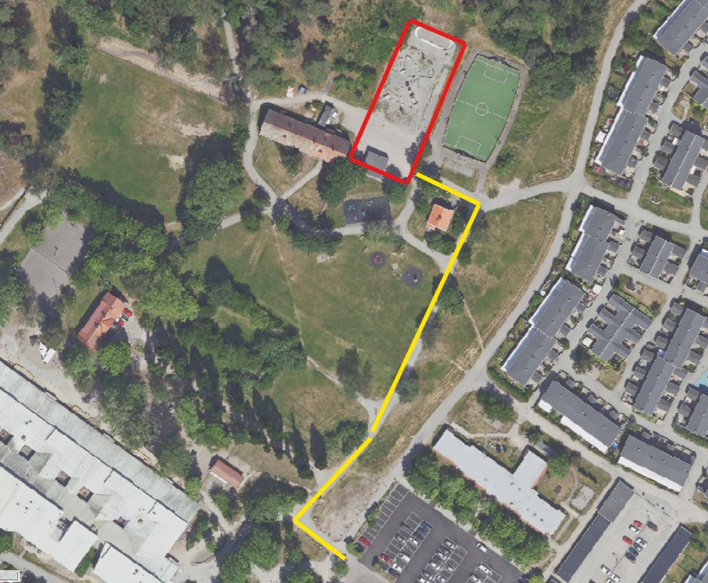 Området inom röd rektangel kommer vara avstängt. Gulmarkerad linje kommer att agera byggväg under entreprenadtiden. Klicka på bilden för att förstora den.